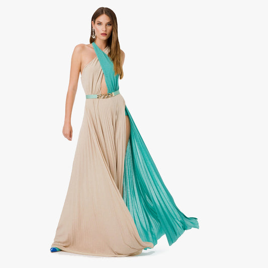 Elisabetta Franchi Belted Two-tone Pleated Long Dress In Neutral